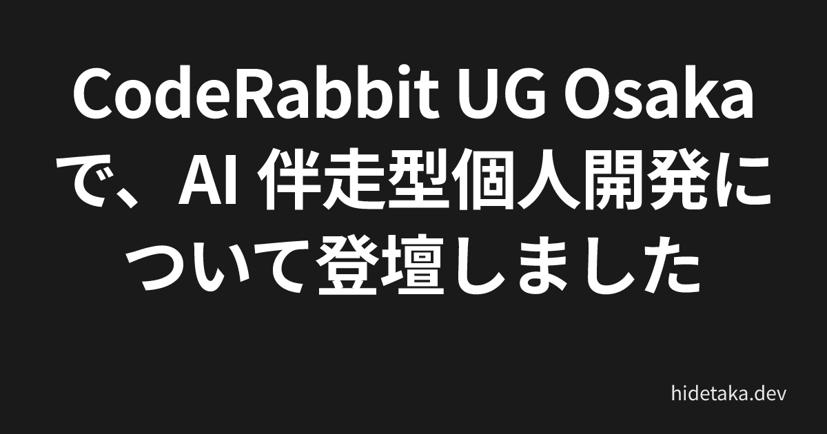 2026年4月10日、CodeRabbit User Group Osaka #1 で「CodeRabbit による AI 伴走型個人開発」というタイトルで登壇しました。この記事では、登壇で話した内容のうち、個人開発者が CodeRabbit を導入する動機になりそうなポイントに絞ってふりかえります。